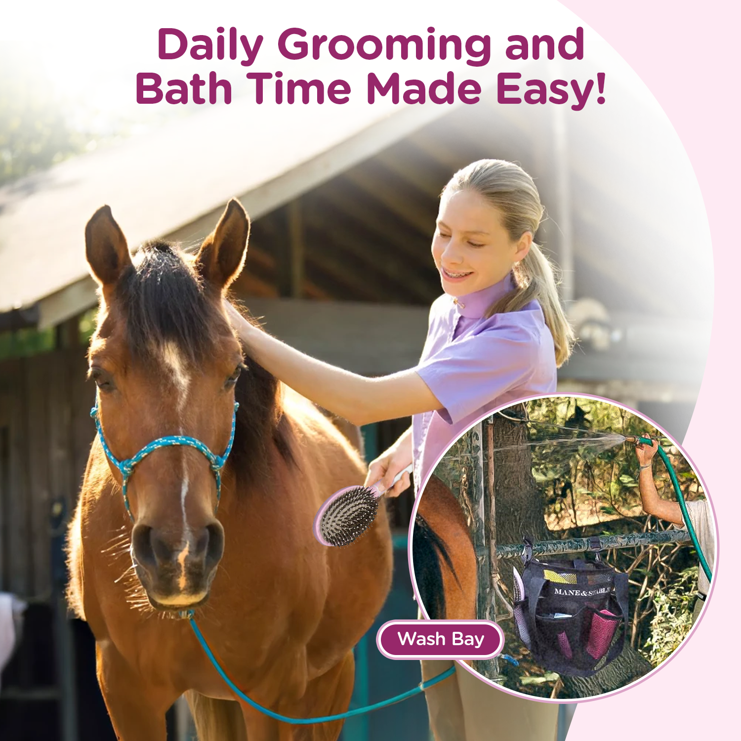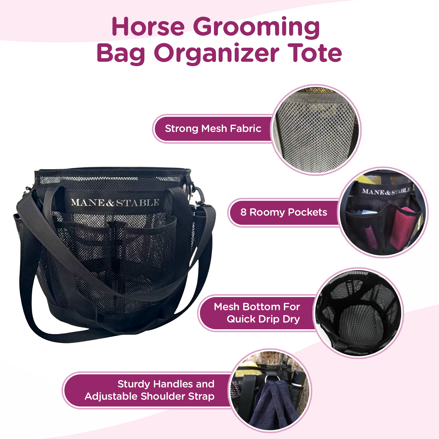 Built to Last, Even in the Toughest Conditions: Whether you're at home or on the road, this durable tote, trusted by professional groomers, stands up to daily use and harsh environments. The sturdy nylon mesh allows air to circulate, preventing odors and keeping your supplies fresh, so you're always ready to give your horse the care it deserves.